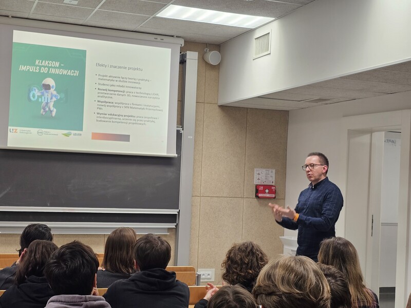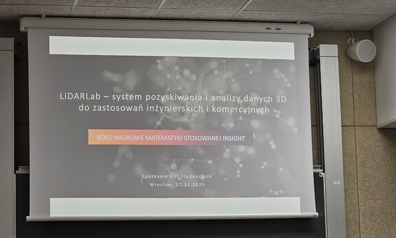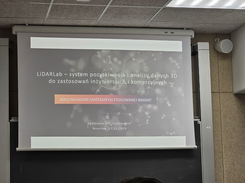 W dniu 27 listopada 2025 r. członkowie Koła Naukowego Matematyki Stosowanej Insight z Uniwersytetu Zielonogórskiego odwiedzili Wydział Matematyki Politechniki Wrocławskiej, gdzie odbyło się spotkanie o charakterze integracyjnym i naukowym, poświęcone prezentacji działalności studenckich kół naukowych oraz nawiązaniu współpracy międzyuczelnianej. W wydarzeniu uczestniczyły cztery koła naukowe PWr: Koło Matematyki Przemysłowej, Koło Naukowe Statystyki Matematycznej Gauss, Koło Naukowe Inżynierii Finansowej przy Centrum Metod Stochastycznych im. Hugona Steinhausa oraz Koło Naukowe Matematyki. Wyjazd został zrealizowany w ramach projektu „LiDARLab – system pozyskiwania i analizy danych 3D do zastosowań inżynierskich i komercyjnych”, dofinansowanego w ramach konkursu „Klakson – Impuls do innowacji”, edycja VI.