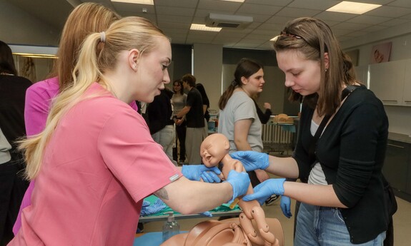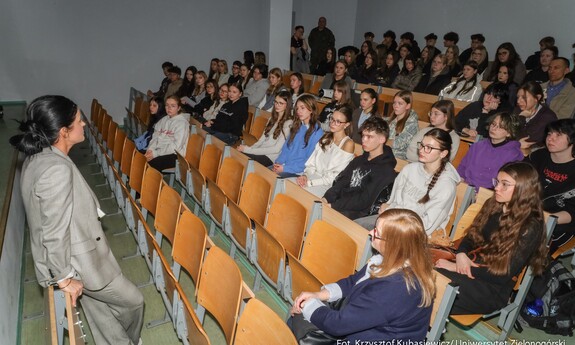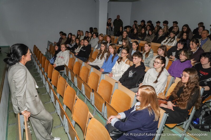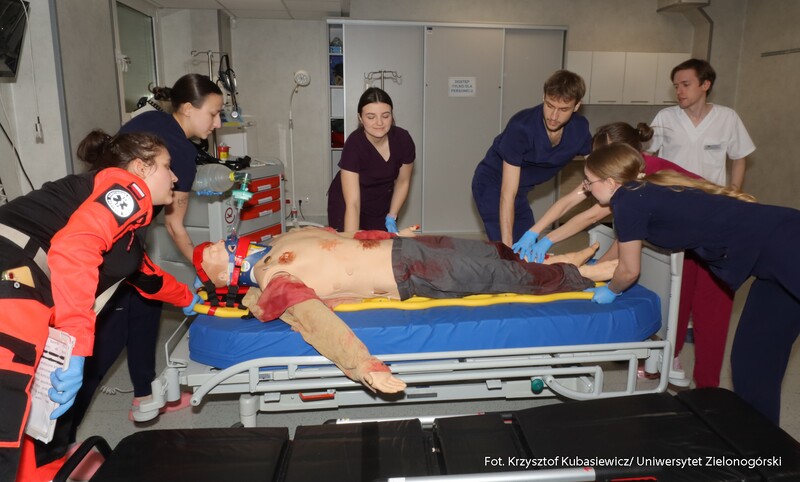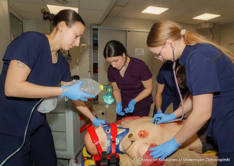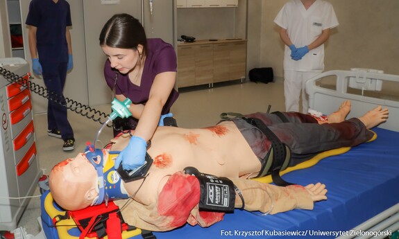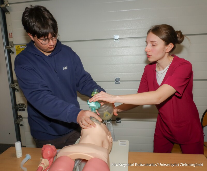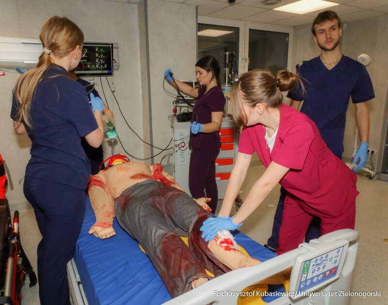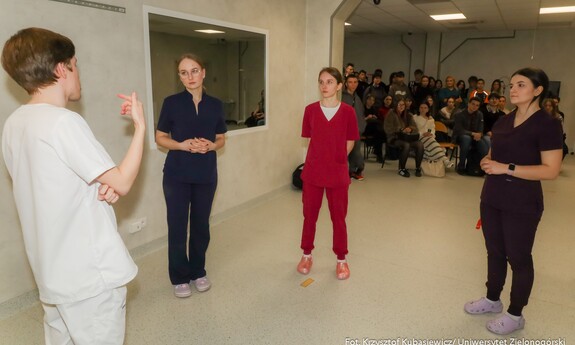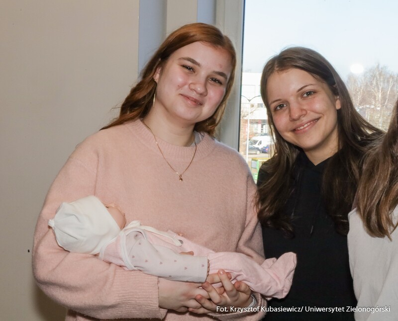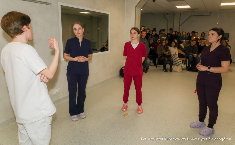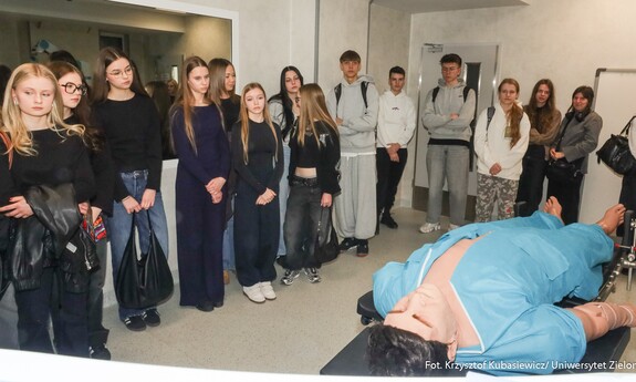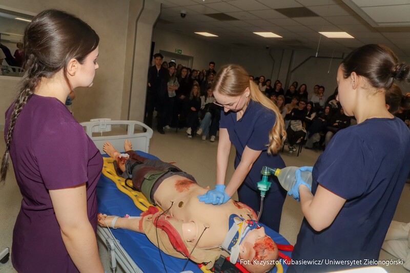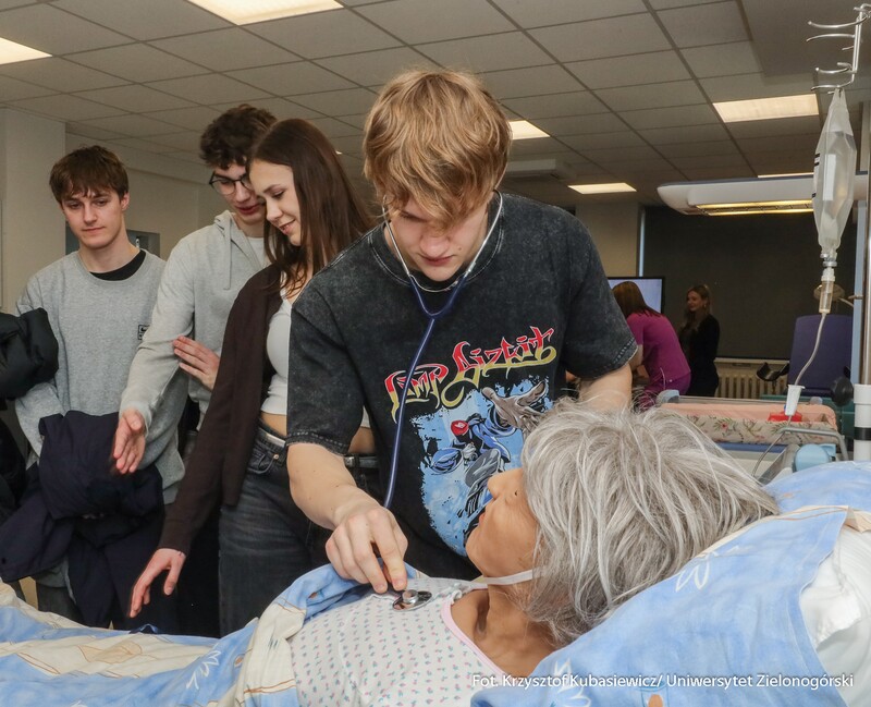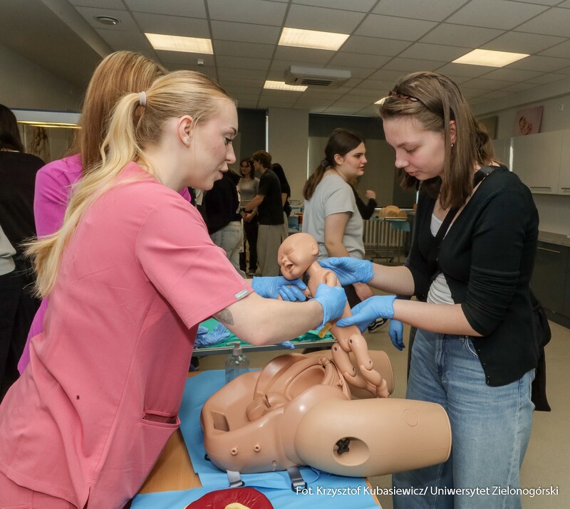 Na uczniów czekało sporo praktyki. Jak tłumaczy inż. Marlena Kincel, technik w Centrum Symulacji Medycznej UZ – na Dni Otwarte przygotowałyśmy razem z moimi koleżankami Pauliną i Klaudią stanowiska na kierunek położnictwo i pielęgniarstwo. Mamy tutaj pierwszą salę położniczą, przygotowałyśmy trenażery do pomiaru ciśnienia krwi, do pobierania krwi, do badania cytologicznego oraz trenażer do porodu. Mamy także przygotowany symulator osoby starczej, który jest w pełni zamonitorowany. Ma podłączoną kroplówkę, pulsoksymetr, ciśnieniomierz. Tutaj mamy fantomy noworodków, które swoją wagą, strukturą skóry, symulują prawdziwe noworodki. Uczniom szczególnie przypadł do gustu ten praktyczny aspekt Dni Otwartych. Mogli spróbować na fantomach różnych procedur medycznych. Jedną z aktywnych uczennic była Nadia z I Liceum Ogólnokształcącego im. Bolesława Krzywoustego w Głogowie – Na samym Dniu było bardzo ciekawie. Doświadczyłam naprawdę wielu ciekawych rzeczy, m.in. dowiedziałam się, że zdałabym egzamin z RKO. Obecność tutaj na Dniu Otwartym może pomóc w ukierunkowaniu się, czy naprawdę kierunek medyczny to jest to. Lubię zagadnienia medyczne, po dzisiejszym Dniu przekonałam się, że to zdecydowanie to, co lubię robić. Dzisiaj podczas prezentacji w Centrum Symulacji Medycznej, pobierałam krew - to znaczy nie wkłuwałam się, bo tego uczy się dopiero na studiach ale ćwiczyłam na fantomie, odebrałam też poród również na fantomie, także było naprawdę interesująco.