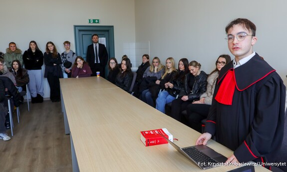 Tegoroczne Wydziałowe Dni Otwarte rozpoczął Wydział Nauk Prawnych i Ekonomicznych. Przybyli licznie uczniowie chętnie uczestniczyli w przygotowanych prezentacjach i wykładach. Wśród ciekawych atrakcji były m.in. quizy i zagadki kryminalne, czy możliwość zrobienia sobie selfie w todze. Uczestnicy poznali także jak wyglądają ich linie papilarne oraz wzięli udział w inscenizacji rozprawy karnej. Jak opisuje Natan Zapał, student III roku na kierunku Prawo: - Zaprezentowana rozprawa sądowa dotyczyła zagadnienia prowadzenia pojazdu pod wpływem alkoholu. Kwalifikacja prawna art. 178a, przyjęta została przez sąd. Podejrzany w rzeczonym kazusie miał 1,5 promila alkoholu w wydychanym powietrzu. Mimo to wsiadł do auta i chciał pojechać do żony. Ja twierdzi oskarżony chciał jej pomóc ponieważ była bardzo chora. Cała rozprawa została przeprowadzona, akt oskarżenia został odczytany, mowy końcowe stron zostały wygłoszone. Co do wyroku – nie został ujawniony. Pozwoliliśmy naszym słuchaczom aby to oni moralnie, w głębi siebie zdecydowali, czy ten pan powinien być skazany za czyn, którego się dopuścił, czy nie. Głosy ze strony publiczności były różne. Parę osób przyjęło linię argumentacyjną obrony, iż jechanie do małżonki było tutaj okolicznością, która spowodowała, że pan miał zostać uniewinniony. Jednak w dominującej części uczniowie, którzy oglądali inscenizację, skazali oskarżonego. Opisuje całą inscenizację i dodaje: - Przygotowywaliśmy się pod okiem dra Mateusza Tomczyka z Instytutu Nauk Prawnych. Spotykaliśmy się tutaj na naszym Wydziale, by się przygotować. Napisaliśmy całą inscenizację rozprawy, tworząc jej obraz, zarys, mowy końcowe. Trzeba było je napisać, nauczyć się ich. Następnie nauczyć się je wygłaszać. Przyjęcie kwalifikacji prawnych oraz sam materiał dowodowy, z którym musieliśmy się zapoznać, też był dosyć obszerny. Ale nasza praca popłaciła, bo przygotowaliśmy dla uczniów pokaz tego, czym będziemy się zajmować w przyszłości.