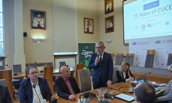 Przedstawiciele wspomnianych ośrodków akademickich wzięli udział między innymi w spotkaniu roboczym, które odbyło się w Sali Senatu UZ i było okazją do krótkiego podsumowania dotychczasowego dorobku sieci CUEEE. Tego typu zebrania odbywają się dwa razy do roku, a ich organizatorami są uczelnie sieci. Spotkania, których terminy zbiegają się z obchodami jubileuszy, mają zwykle uroczysty charakter. Tym razem delegacje uczelni sieci spotkały się z prof. dr. hab. Wojciechem Strzyżewskim – Rektorem UZ, prof. dr hab. inż. Justyną Patalas-Maliszewską - prorektor ds. Nauki i Współpracy z Zagranicą UZ oraz prof. dr. hab. inż. Andrzejem Obuchowiczem - dziekanem Wydziału Nauk Inżynieryjno-Technicznych UZ.