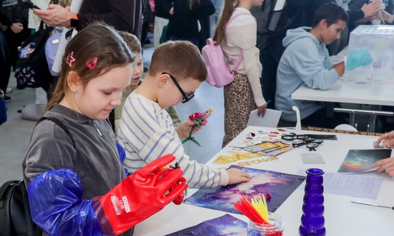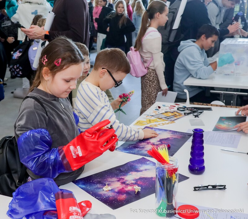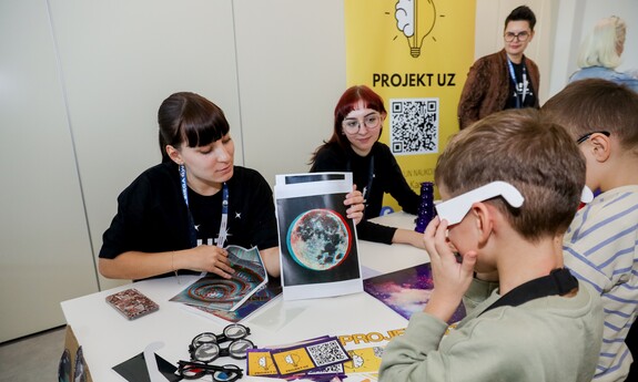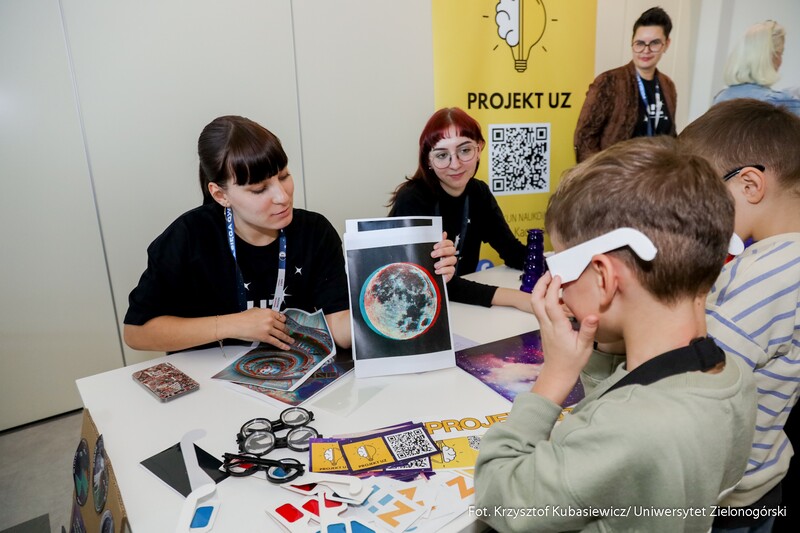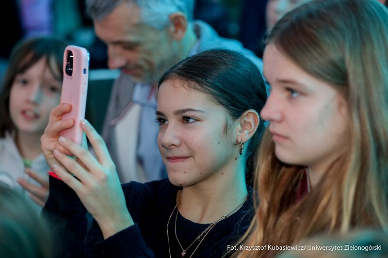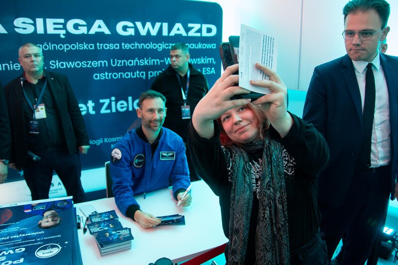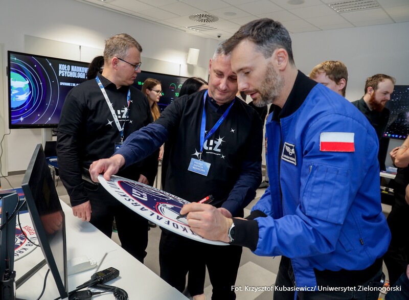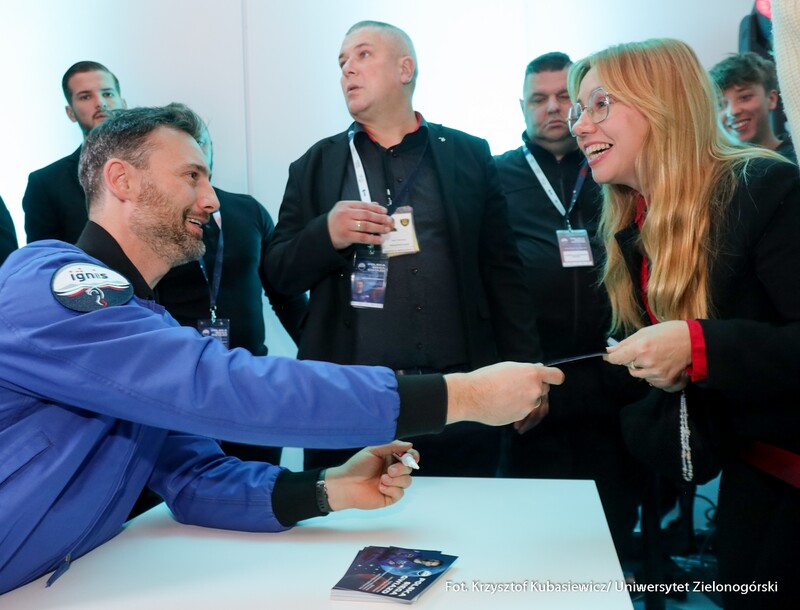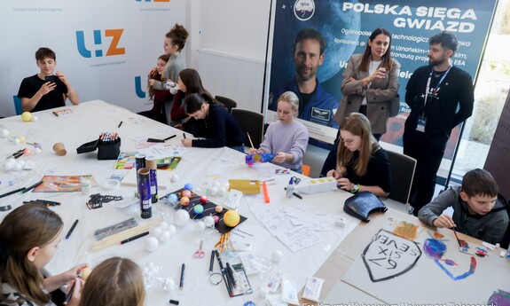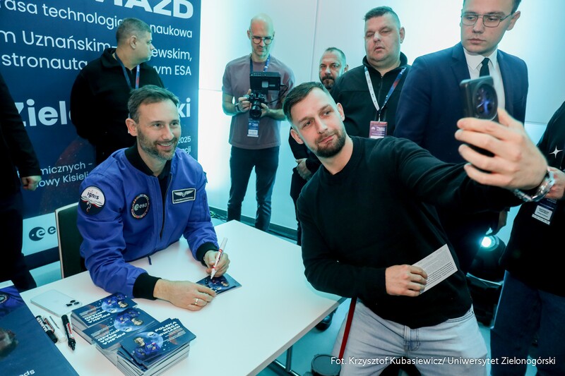 Druga część wydarzenia przyjęła formę edukacyjną i było to spotkanie skierowane do uczniów szkół podstawowych i ponadpodstawowych z całego naszego regionu. Dzieci oraz młodzież wzięły udział nie tylko w spotkaniu z dr. Sławoszem Uznańskim-Wiśniewskim, ale również w kreatywnych warsztatach i zabawach. Celem wydarzenia była popularyzacja wiedzy o kosmosie i nowoczesnych technologiach, dlatego i tutaj nie zabrakło strefy kół studenckich. O młodszych uczestników czwartkowego spotkania zadbali przedstawiciele KN BiomedUZ, Naukowego Koła Logopedycznego „Mowa bez wad”, KN Projekt UZ, KN Biotechnologów UZ, KN Architektury Eksperymentalnej KONSTRUKTURA, KN La Luce, KN Fortezza, KN Tekturka oraz Studenckie Koło Psychoonkologii Klinicznej „Żonkil”. Podsumowaniem części edukacyjnej było także wspólne zdjęcie z astronautą oraz rozdawanie autografów przez bohatera wydarzenia.