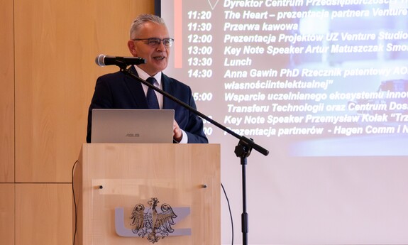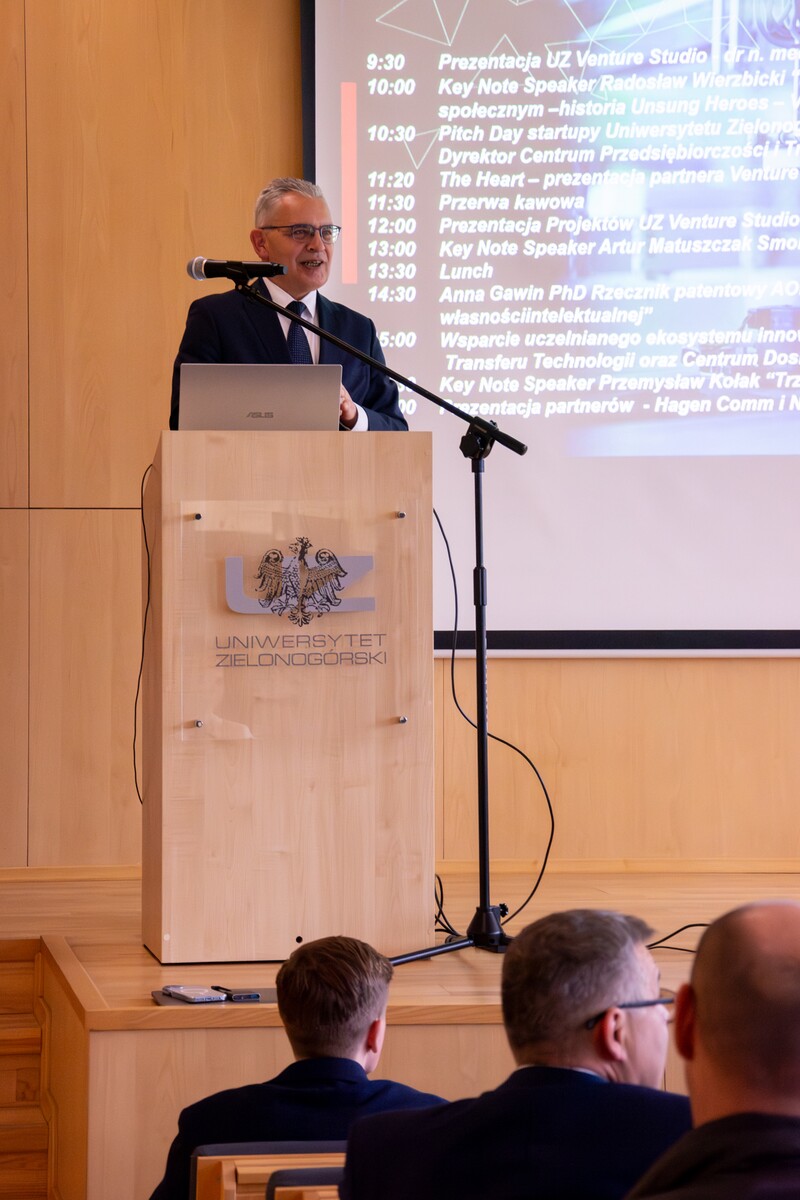 Konferencję uroczyście otworzył rektor Uniwersytetu Zielonogórskiego – prof. Wojciech Strzyżewski, który pogratulował osobom zaangażowanym w projekt i życzył powodzenia w dalszej realizacji pomysłów oraz owocnego wspierania przedsiębiorczości uczelni. Na uroczystości była obecna również prorektor ds. nauki i współpracy z zagranicą – prof. Justyna Patalas-Maliszewska oraz kanclerz UZ – dr inż. Katarzyna Łasińska, która od początku mocno wspierała przedsięwzięcie. Następnie głos zabrał kierownik projektu - dr n. med. MBA Rafał Kieszek, który przedstawił zakres działalności UZ Venture Studio i podsumował ostatnie miesiące pełne intensywnej, aczkolwiek zakończonej pomyślnie, pracy. – Ideą było stworzenie ekosystemu startupowego w postaci Venture Studio, czyli venture buildingu, który wyławia pomysły akademickie, uczelniane czy okołouczelniane, które mają potencjał komercjalizacyjny i praca z nimi na poziomie organicznym, czyli wchodzenie wewnątrz tych zespołów ze specjalistami z rynku, żeby zbudować dobrze działające startupy, które mają szansę zaistnieć na rynku i odnieść sukces komercyjny – tłumaczył dr n. med. MBA R. Kieszek.