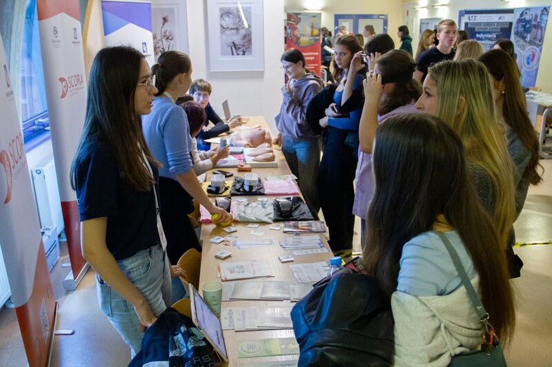Wszystkie piętra zapełniły stoiska kilkudziesięciu kół naukowych i organizacji studenckich repezentujących różne dziedziny nauki i kierunki studiów. Odwiedzający poruszali się przez następujące strefy: Umysł i Wszechświat, Inżynieria i Design, Myśl i Społeczeństwo, Medycyna, Zdrowie i Technologie, Nowe technologie oraz Biologia i Natura. Każde piętro oferowało mnóstwo atrakcji oraz praktycznych sposobów na naukę i zapoznanie się ze specyfiką danego kierunku. Prowadzono prezentacje, pokazy, eksperymenty, badania i pomiary czy też gry i zabawy. Również przed budynkiem na uczniów czekały niespodzianki, a mianowicie szybowiec i strefa sportowa. Co więcej, wizyta na uczelni była dla młodzieży niepowtarzalną okazją do rozmów z wykładowcami oraz - co im najbliższe - z obecnymi studentami. Wszyscy wystawcy życzliwie przyjęli naszych gości, co stworzyło przesympatyczną atmosferę i wywarło bardzo dobre wrażenie.