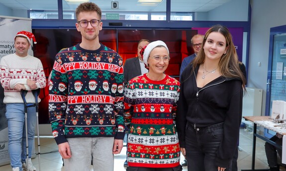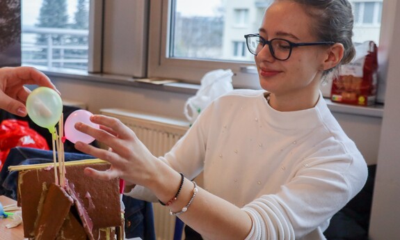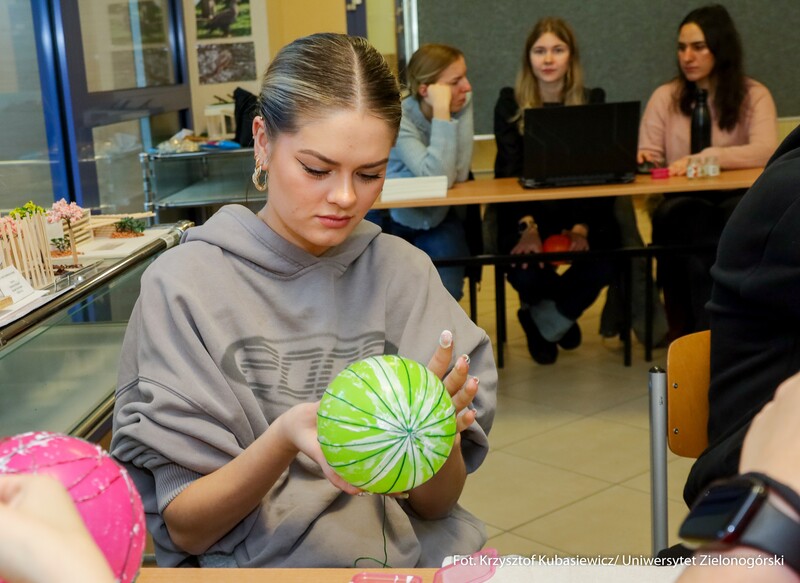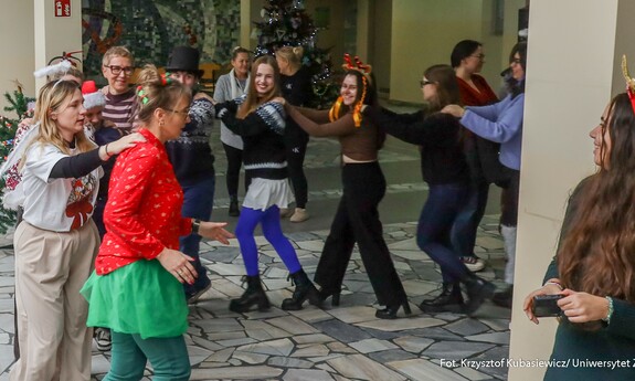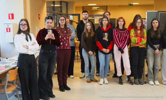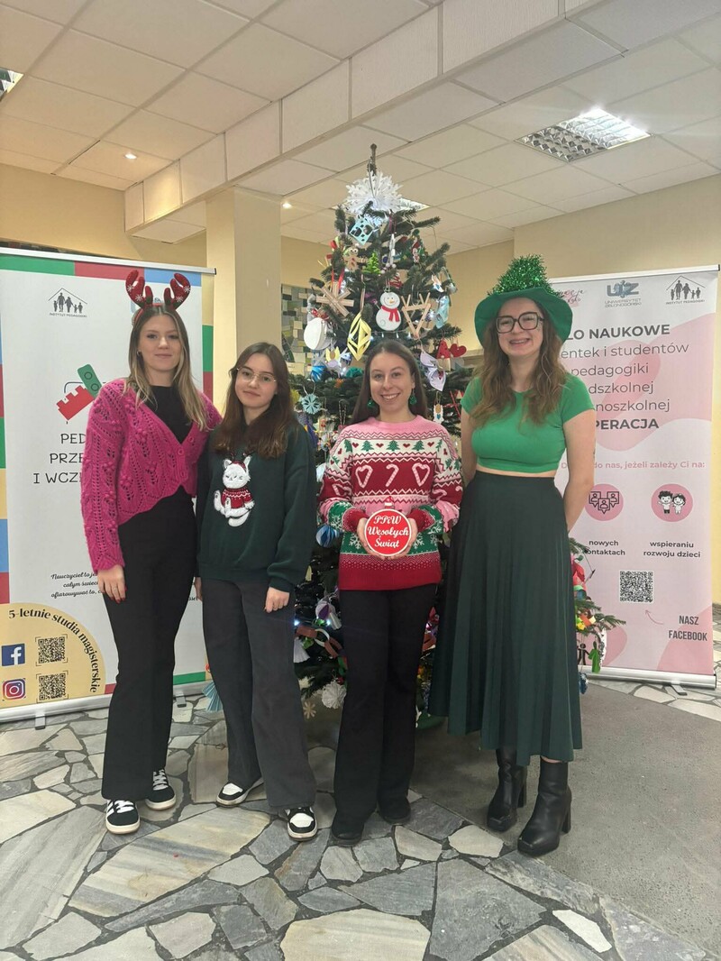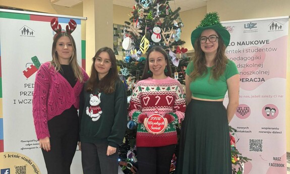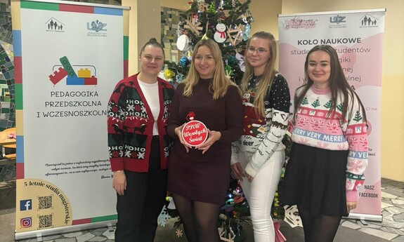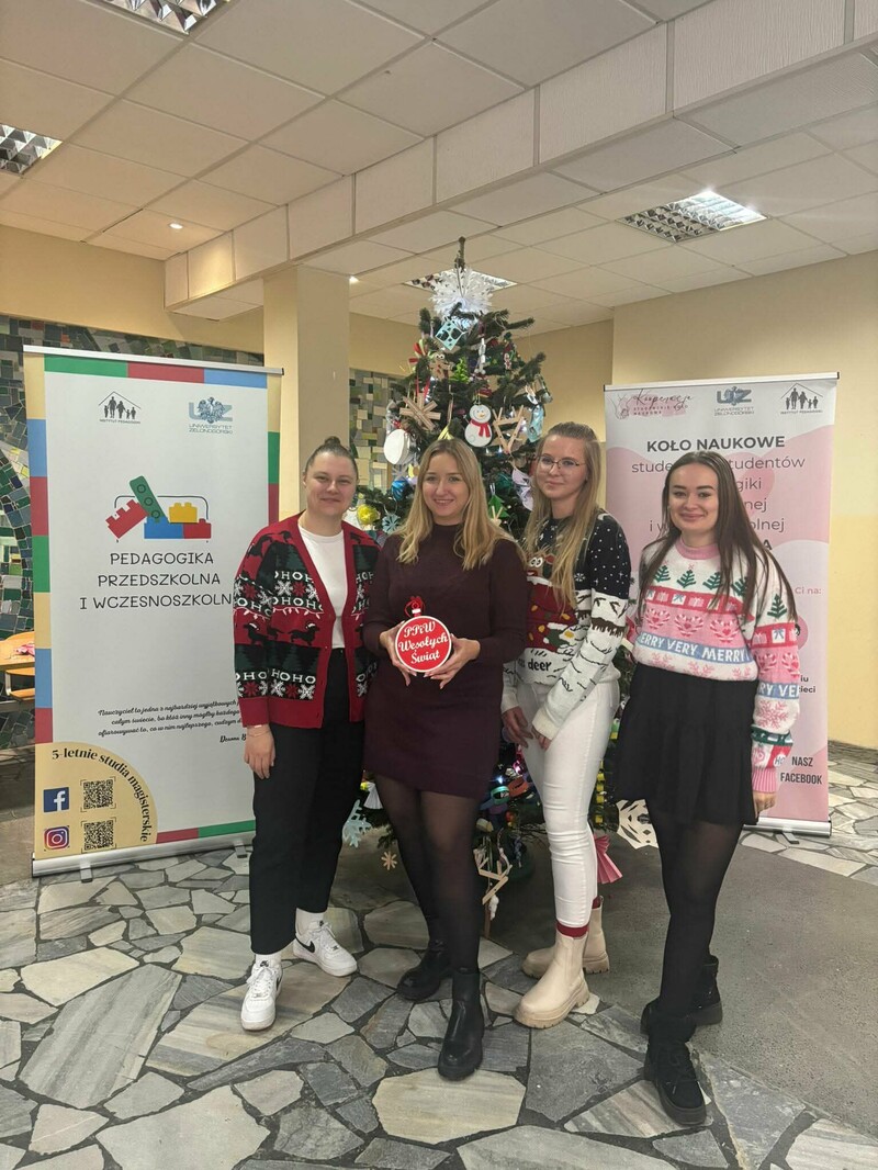 Koło Naukowe „Kooperacja” zorganizowało 3 grudnia br. w Palmiarni na Kampusie B świąteczne warsztaty muzyczne i plastyczne dla dzieci z zielonogórskiego przedszkola. Ważnym punktem spotkania było ubieranie choinki. Akcja „Zielonogórskie dzieci stroją choinki na Święta Bożego Narodzenia” jest organizowana co roku. Było kreatywnie, muzycznie i bardzo świątecznie. - Wspólnie tworzyliśmy kolorowe bombki, łańcuchy oraz ozdoby, które później zawisły na naszej pięknej choince. Najmłodsi mieli też okazję sami ją udekorować – efekt był naprawdę magiczny! - wspominają przedstawiciele Koła „Kooperacja”. Tego samego dnia studenci I roku pedagogiki przedszkolnej i wczesnoszkolnej oraz wychowania fizycznego zorganizowali Koncert Świąteczny. Można było posłuchać współczesnych utworów o tematyce świątecznej takich jak „All I Want for Christmas”, czy „Last Christmas” oraz wspólnie zaśpiewać tradycyjne kolędy takie jak „Wśród nocnej ciszy”, „Cicha noc”, czy „Przybieżeli do Betlejem”.