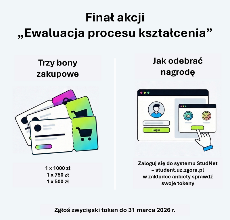 Prosimy o sprawdzenie w systemie StudNet w zakładce ankiety do kogo należą zwycięskie i rezerwowe tokeny i zgłoszenie tego faktu do dr Jarosława Wagnera drogą mailową (jwagner@uz.zgora.pl) do 31 marca 2026 r. do godziny 15.00. Po weryfikacji tokenów studenci zostaną poinformowani o terminie wręczenia nagród.