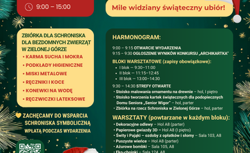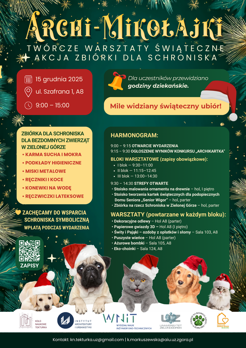 Szczególnym elementem Archi-Mikołajek będzie zbiórka darów dla Schroniska dla Bezdomnych Zwierząt w Zielonej Górze (karma sucha i mokra, miski metalowe, ręczniki, koce, podkłady higieniczne, akcesoria). Dodatkowo studenci–wolontariusze schroniska będą prowadzić zbiórkę pieniędzy do puszek, aby wesprzeć bieżące potrzeby zwierząt.