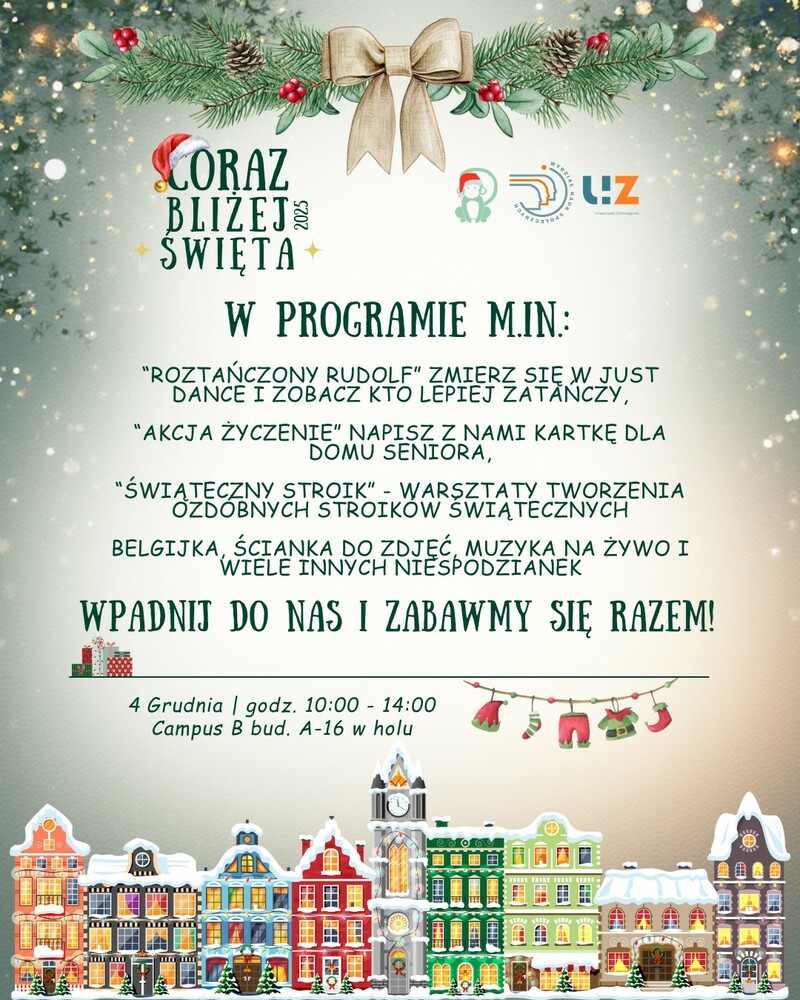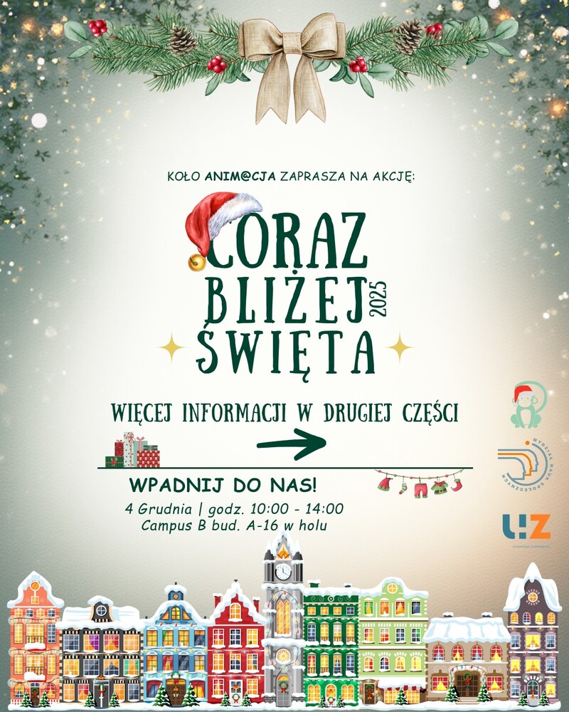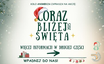 Koło Naukowe Anim@cja zaprasza po raz kolejny na mikołajkową akcję animacyjną "Coraz bliżej święta...", by wspólnie celebrować zbliżające się Święta Bożego Narodzenia.