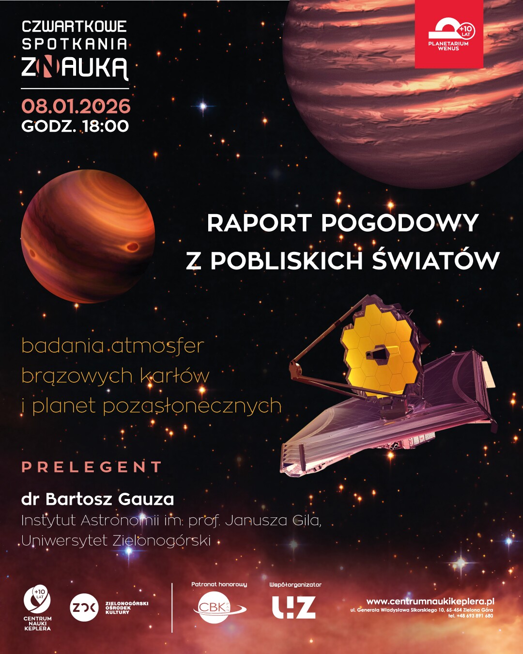 Chciałbym przedstawić wyniki najnowszych badań, wykorzystujących obserwacje kosmicznego teleskopu Jamesa Webba, ukazujących po raz pierwszy dynamiczne procesy i zjawiska pogodowe zachodzące na najzimniejszych znanych brązowych karłach oraz bezpośrednio obserwowanych planetach pozasłonecznych. A także o nowym spojrzeniu w głąb ich atmosfer, ukazującym różnorodne procesy i związki chemiczne które w nich występują - dr Bartosz Gauza.