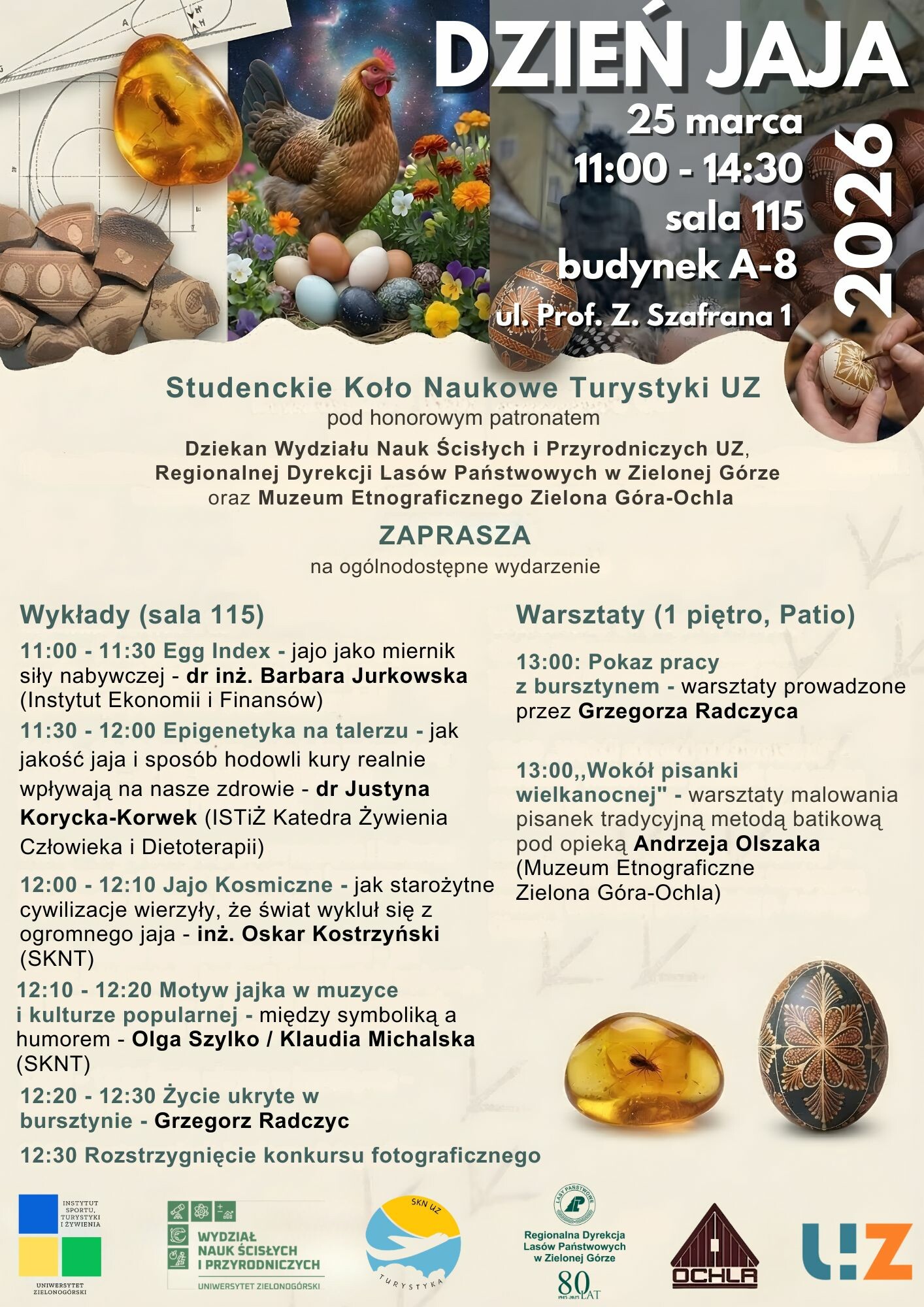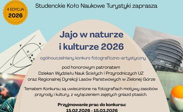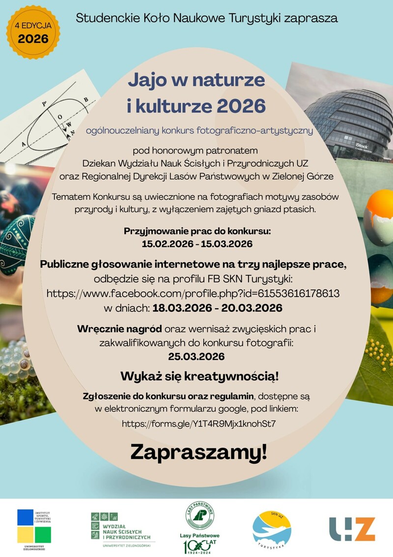 Po wykładach odbędzie się wręczenie nagród zwycięzcom konkursu fotograficzno-artystycznego "Jajo w naturze i kulturze 2026" (w dniach od 18 do 20 marca można głosować na prace zakwalifikowane do cyklicznego konkursu „Jajo w naturze i kulturze 2026” na oficjalnym profilu Fb Studenckiego Koła Naukowego Turystyki UZ ).