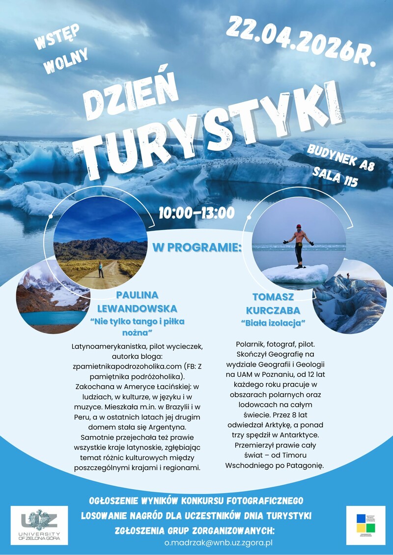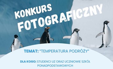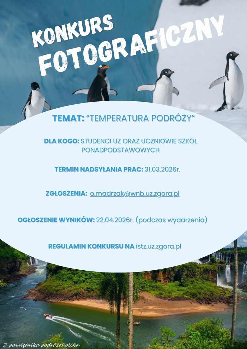 Zapraszamy studentów UZ oraz uczniów szkół ponadpodstawowych do udziału w konkursie fotograficznym "Temperatura podróży". Zgłoszenia można nadsyłać do 31.03.2026 r. na adres: o.madrzak@wnb.uz.zgora.pl. Wręczenie nagród odbędzie się 22.04.2026 r. podczas Dnia Turystyki. Najlepsze prace zostaną zaprezentowane na wystawie w trakcie wydarzenia. Regulamin konkursu dostępny na: www.istz.uz.zgora.pl/aktualnosci