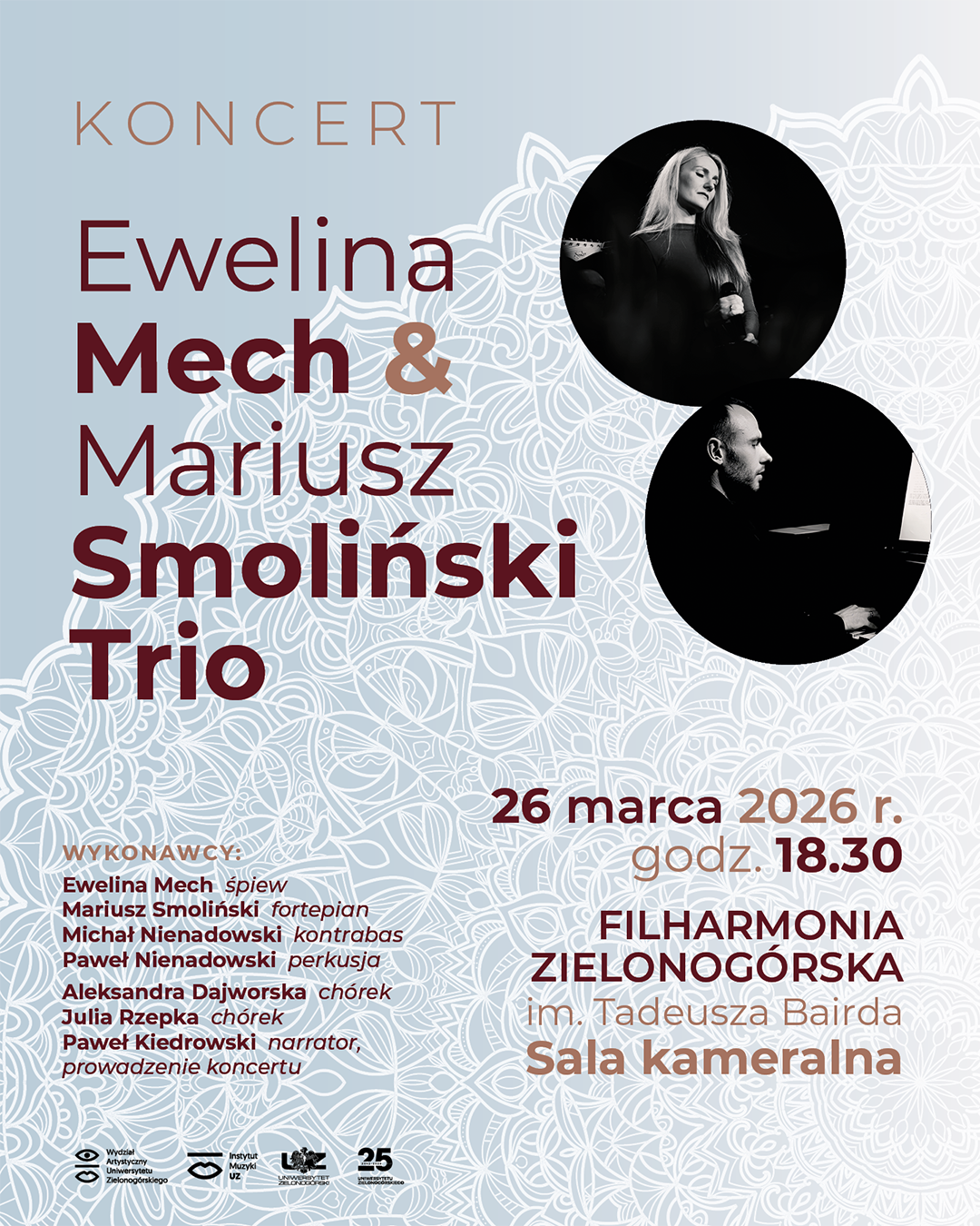 Społeczności akademicka, zaczynamy świętowanie! W ramach tegorocznych obchodów 25-lecia Uniwersytetu Zielonogórskiego zapraszamy na wyjątkowy muzyczny wieczór. 26 marca br. o godzinie 18:30 w sali kameralnej Filharmonii Zielonogórskiej im. Tadeusza Bairda będzie można wysłuchać koncertu pt. Ewelina Mech & Mariusz Smoliński Trio.