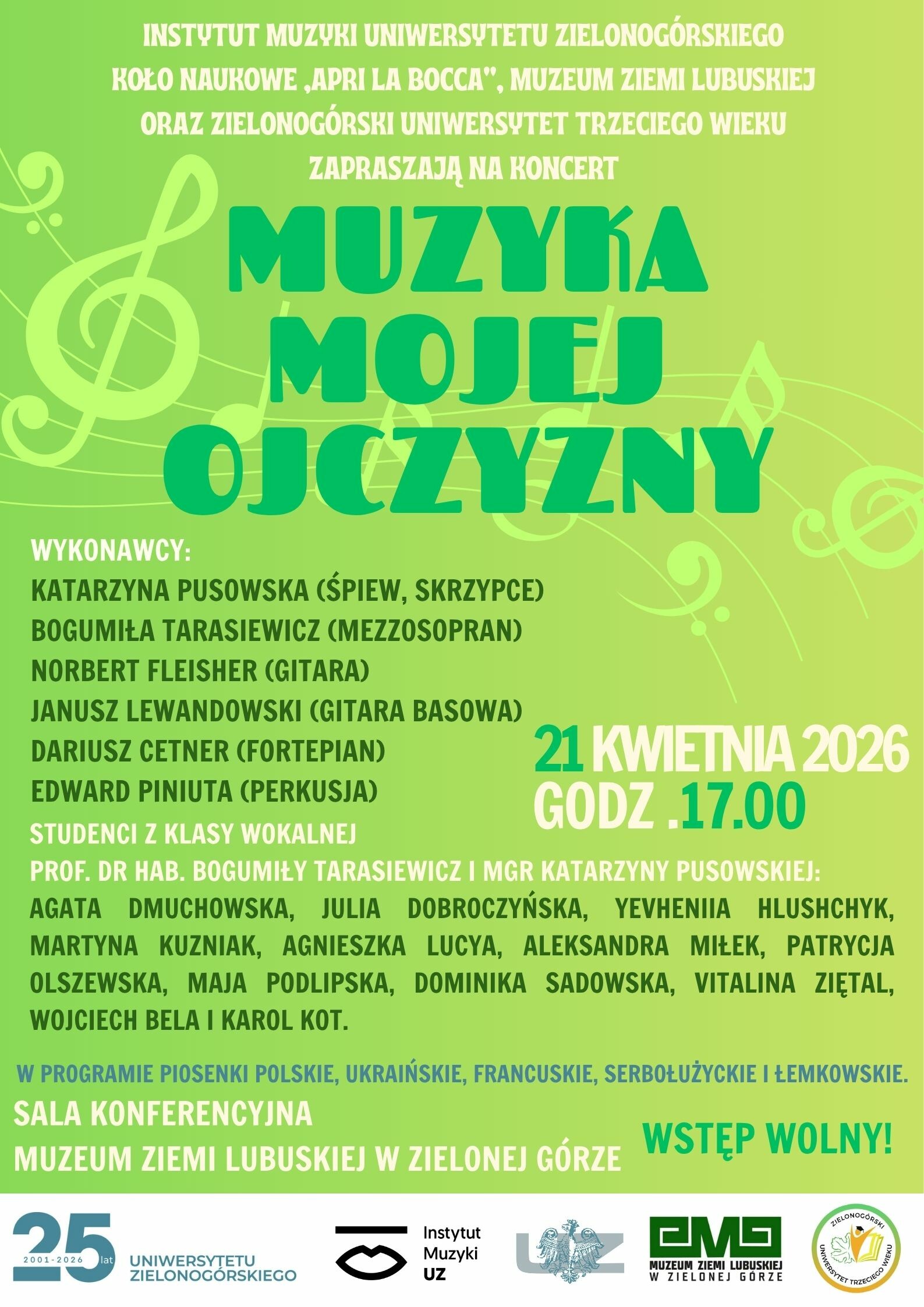 Studenci Koła Naukowego „Apri la bocca” zapraszają na koncert zatytułowany „Muzyka mojej ojczyzny”.