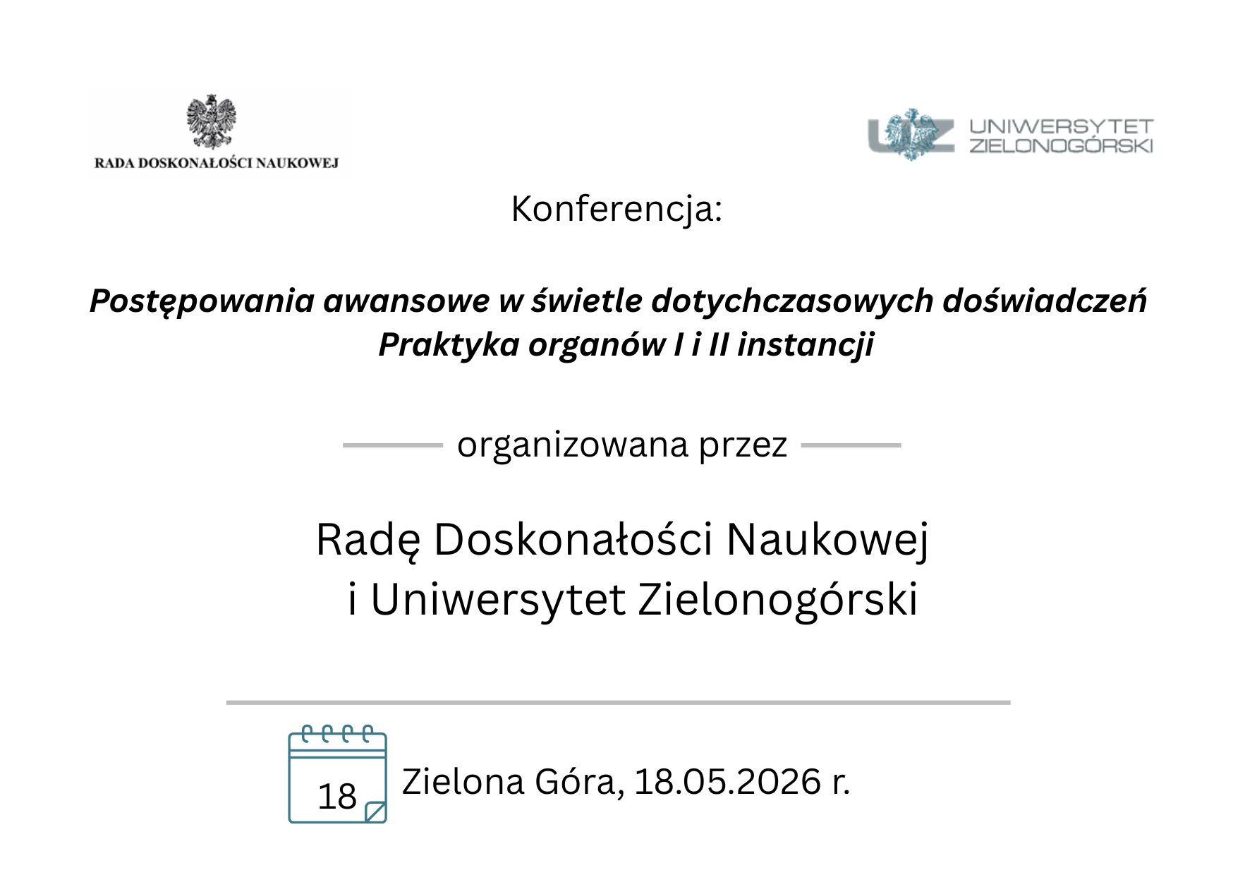 Konferencja szkoleniowa pt. „Postępowania awansowe w świetle dotychczasowych doświadczeń. Praktyka organów I i II instancji” organizowana jest z inicjatywy Rady Doskonałości Naukowej oraz Uniwersytetu Zielonogórskiego. Wydarzenie odpowiada na rosnące zainteresowanie środowiska naukowego problematyką postępowań awansowych oraz potrzebę upowszechniania wiedzy i dobrych praktyk w tym zakresie.