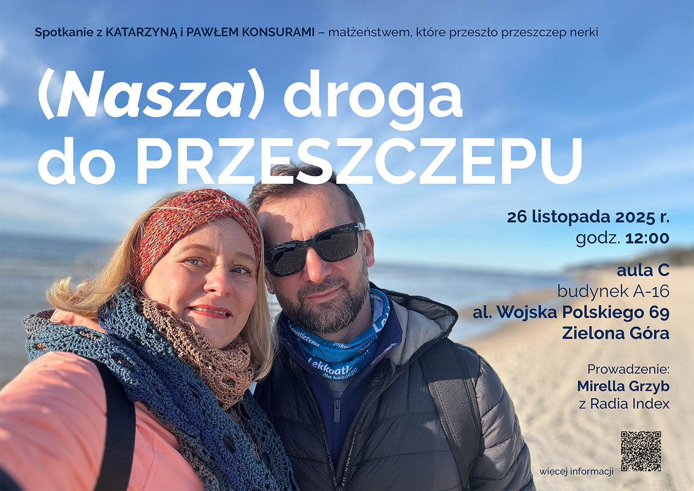 W ramach kontynuacji obchodów jubileuszu Biegu dla transplantacji zapraszamy na wyjątkowe spotkanie pt. „(Nasza) droga do przeszczepu” z Katarzyną i Pawłem Konsurami - małżeństwem, które przeszło rodzinny przeszczep nerki. Wydarzenie odbędzie się 26 listopada br. o godz. 12:00 w auli C, w budynku A-16 na kampusie B. Zachęcamy do wysłuchania emocjonalnej opowieści o walce o zdrowie i poświęceniu, jakim jest podarowanie życia bliskiej osobie.