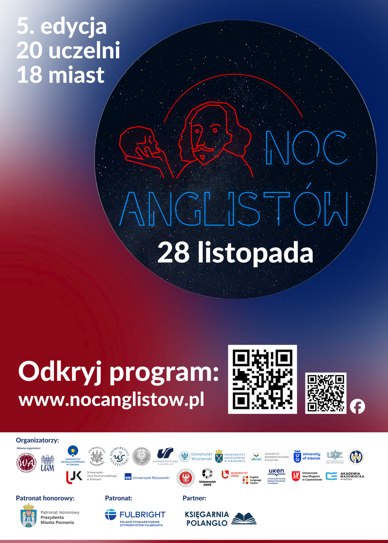 28 listopada br. już po raz trzeci Uniwersytet Zielonogórski dołącza do ogólnopolskiego wydarzenia Noc Anglistów – wyjątkowego wieczoru, podczas którego język angielski, kultura i literatura angielskiego obszaru językowego spotykają się z pasją, kreatywnością i naukową refleksją.