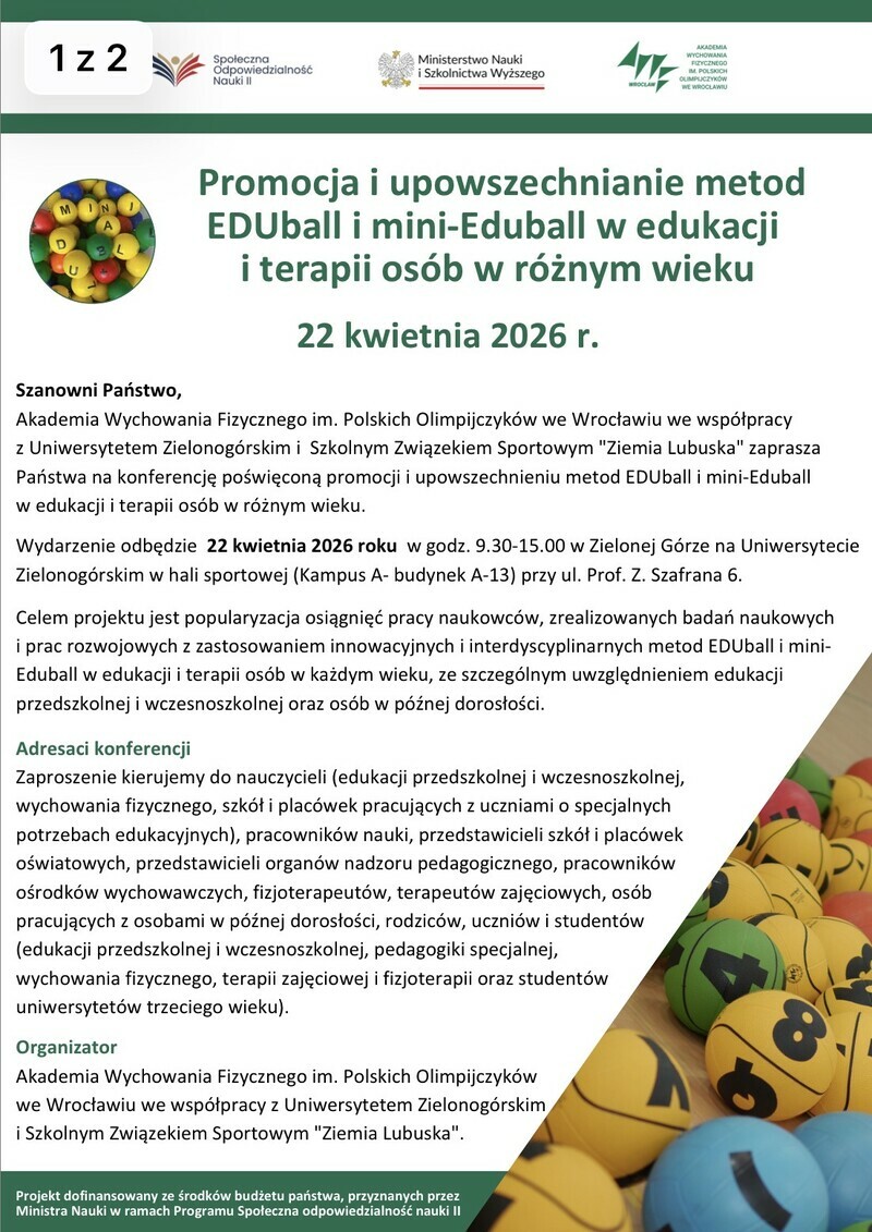 Konferencja poświęcona promocji i upowszechnieniu metod EDUball i mini-Eduball w edukacji i terapii osób w różnym wieku.