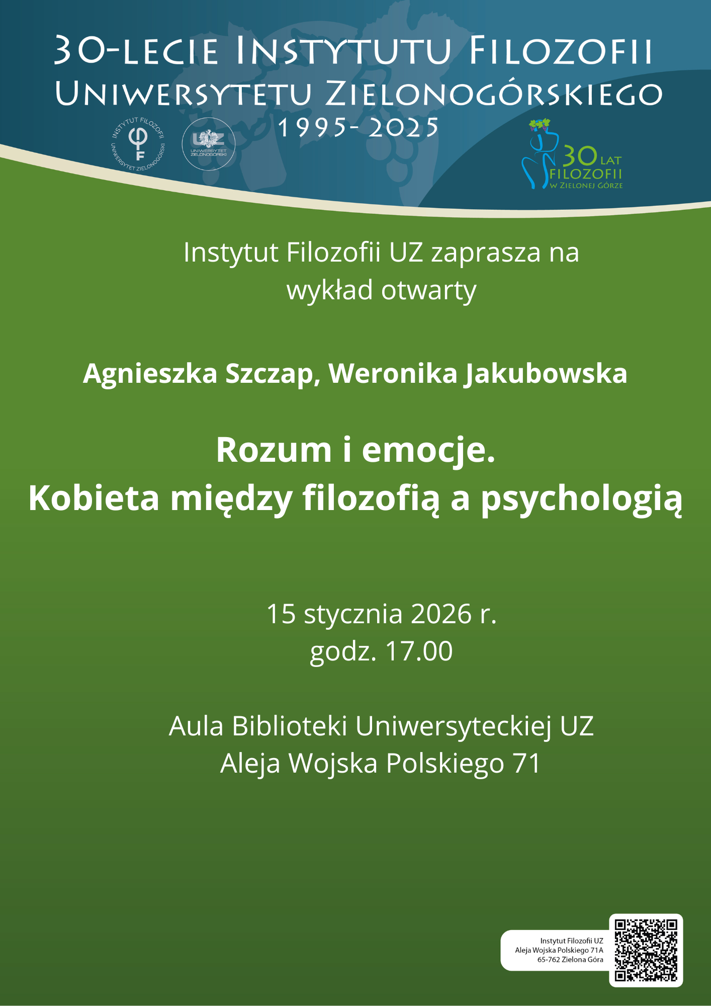 Z okazji 30-lecia istnienia Instytutu Filozofii Uniwersytetu Zielonogórskiego przygotowano cykl wykładów otwartych, w którychy zaprezentują się jego obecni pracownicy.