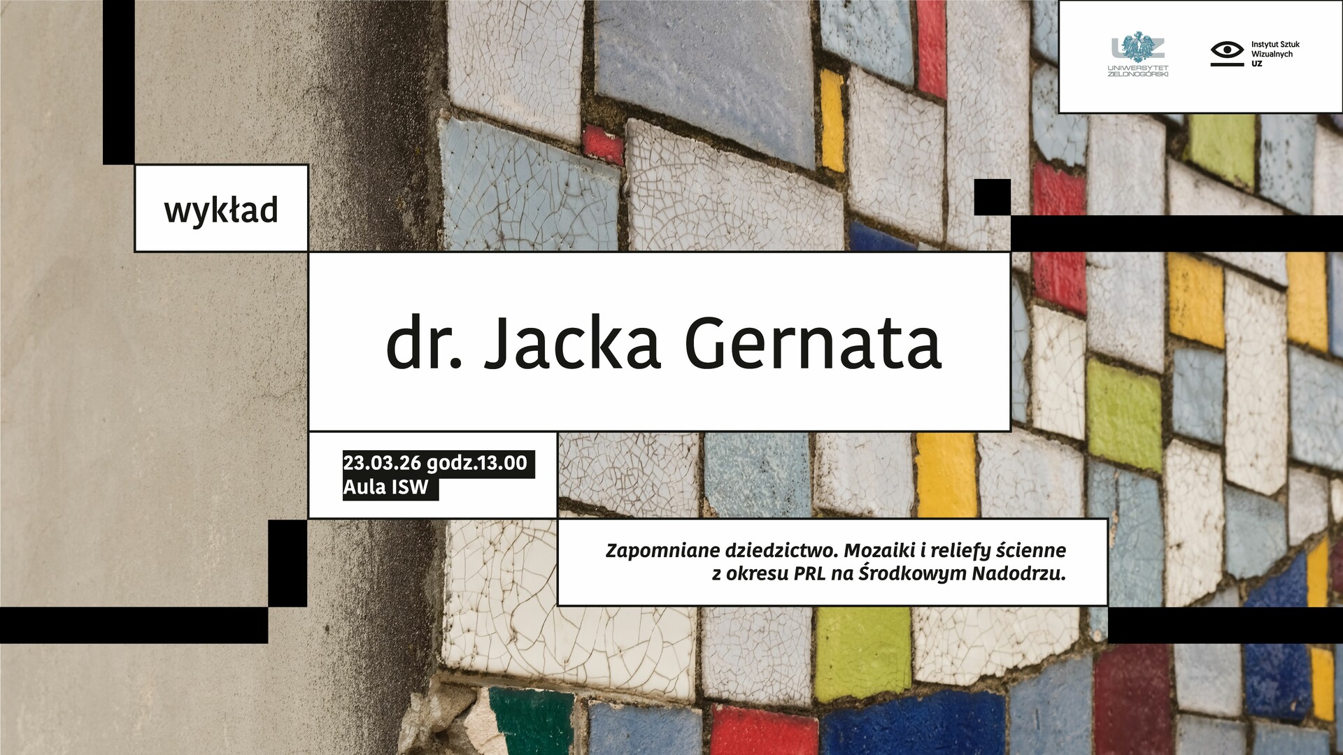 W wystąpieniu zaprezentowane zostaną wybrane mozaiki i reliefy ścienne z okresu PRL na Środkowym Nadodrzu, z wyróżnieniem dzieł zaliczających się do mozaik (przeważnie ceramicznych), reliefowych płyt okładzinowych oraz kompozycji na pograniczu mozaiki i reliefu.