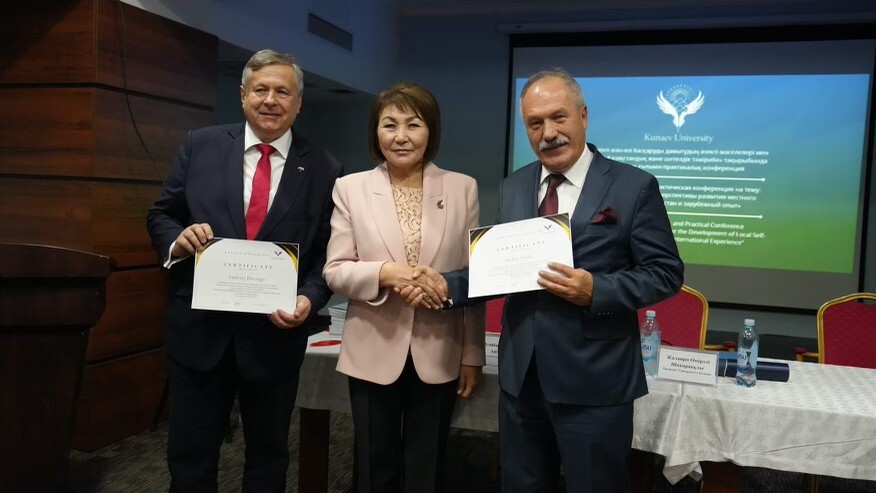Prof. Andrzej Bisztyga z certyfikatem uczestnictwa w ministerialnym grancie naukowym. Certyfikat wręczyła Kierownik grantu prof. Gulnar Alibayeva z Uniwersytetu Narchoz w Ałmaty
